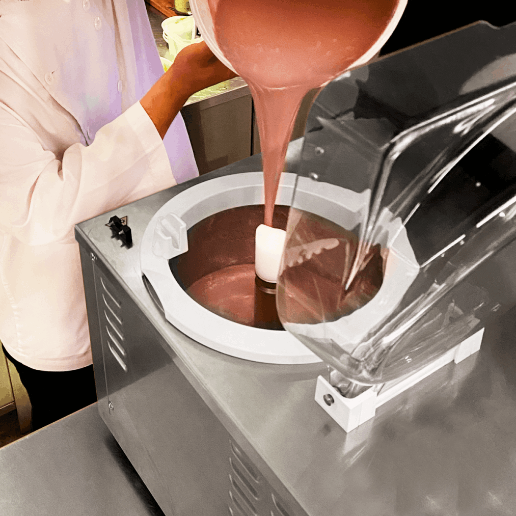 The continuous churning process is done in front of costumers, adding fresh liquid mix as the product is served.